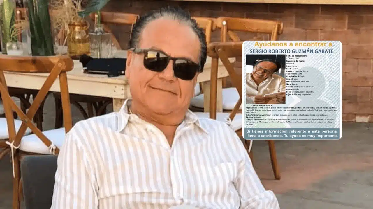 La Comisión Estatal de Búsqueda de Personas de Sinaloa emitió una ficha de búsqueda para dar con el paradero del empresario inmobiliario Sergio Roberto Guzmán Garate, quien desapareció desde el pasado 9 de enero. El reporte fue viralizado esta semana por su hija Samantha, quien desde sus redes sociales pidió apoyo a las autoridades para que su papá regrese a casa.