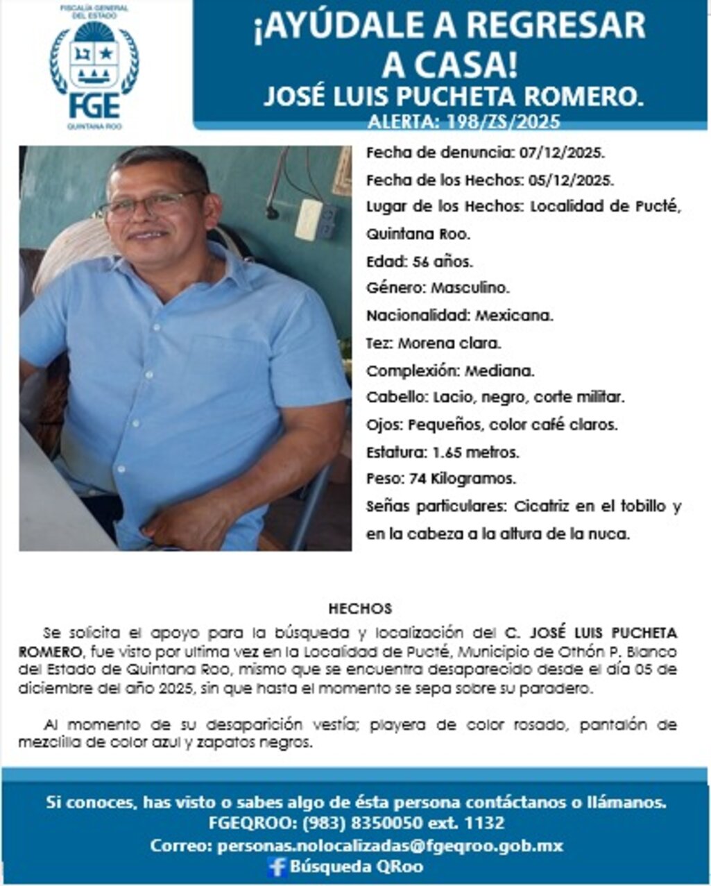 Chetumal, 8 de diciembre.- La Fiscalía General del Estado de Quintana Roo activó un protocolo de búsqueda para dar con el paradero de José Luis Pucheta Romero, un hombre de 56 años reportado como desaparecido desde el pasado 5 de diciembre en la comunidad de Pucté. La institución difundió los datos oficiales a través de la ficha 198ZS/2025, con el objetivo de solicitar la colaboración de la ciudadanía.