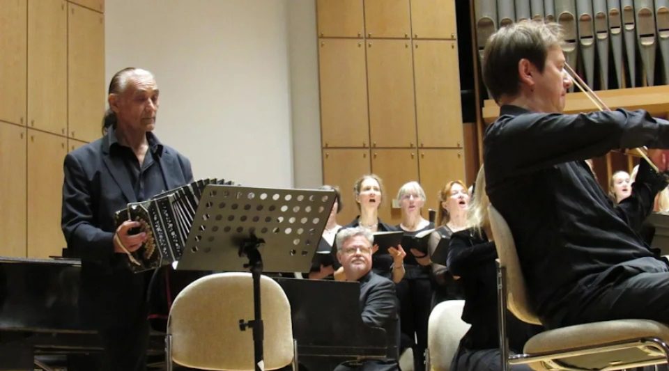 La mirada concentrada del bandoneonista Gilberto Pereyra acapara la atención del público heterogéneo que llena el Aula de la Universidad de Bonn. Junto a él, la soprano china Tianjao Yin, una pequeña orquesta de cuerda formada por músicos de la Orquesta Beethoven y el Coro del Festival Internacional LiberArte 2025, que cuenta con miembros latinoamericanos y alemanes. Al piano, Martín Palmeri y, a la batuta, Pablo Quinteros. La obra Aeneis, del también argentino José Luis Larzábal, completa el programa.