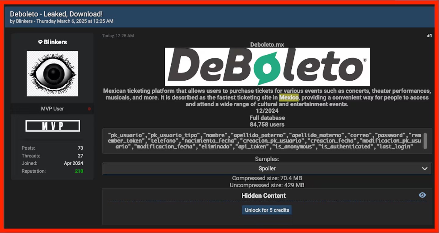 Más de 84 mil cuentas de usuarios de DeBoleto.mx, una de las principales plataformas de venta de boletos para eventos en México, fueron filtradas y ahora circulan abiertamente en foros clandestinos de hackers. La información expuesta no solo incluye nombres completos, correos y teléfonos, sino también contraseñas cifradas, historiales completos de compra, registros de pagos procesados e incluso tokens de acceso directo a las cuentas.