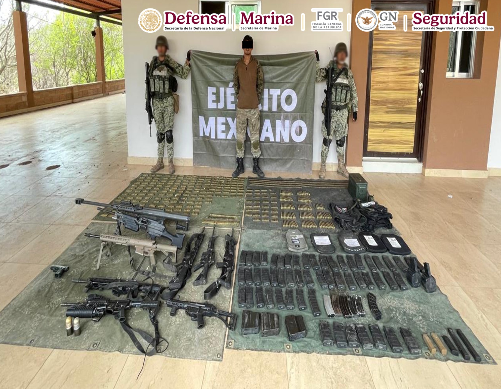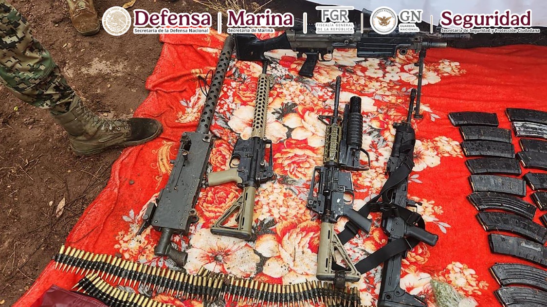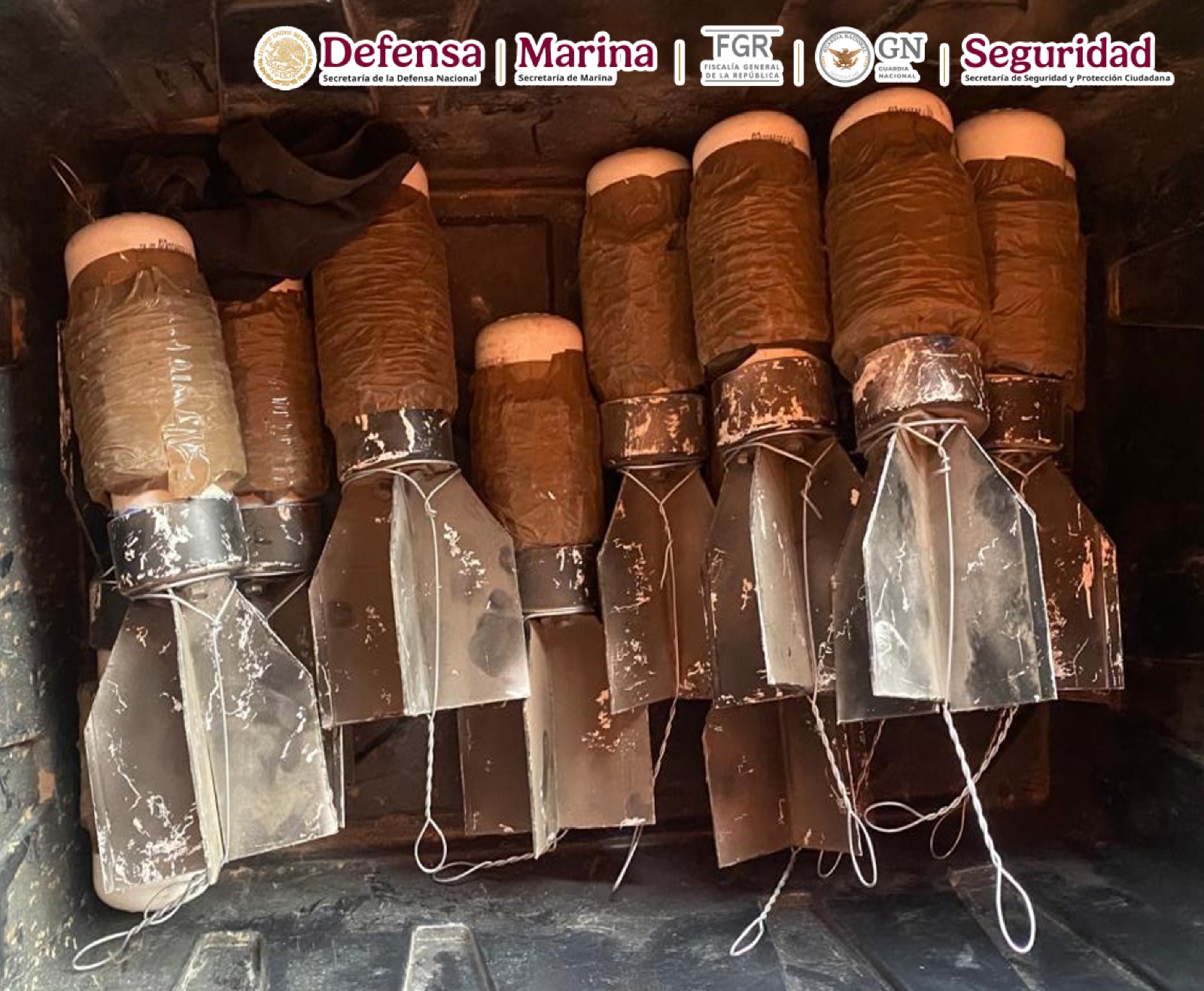 Les aseguraron siete armas largas, un arma corta, cartuchos útiles, 62 cargadores, una bolsa con marihuana, dinero en efectivo, 10 vehículos, equipo táctico, un laboratorio clandestino, 200 litros de acetona, 75 kilos de sosa cáustica, 10 antenas y 47 artefactos explosivos improvisados.
