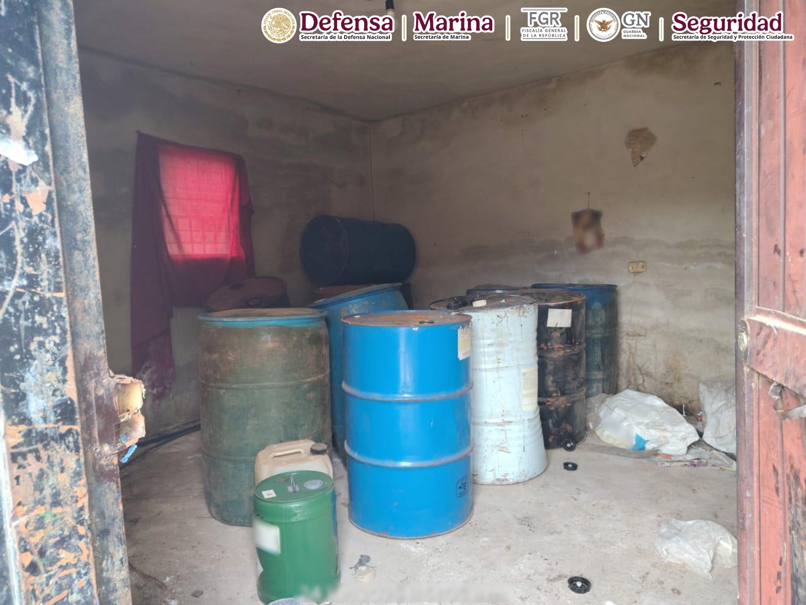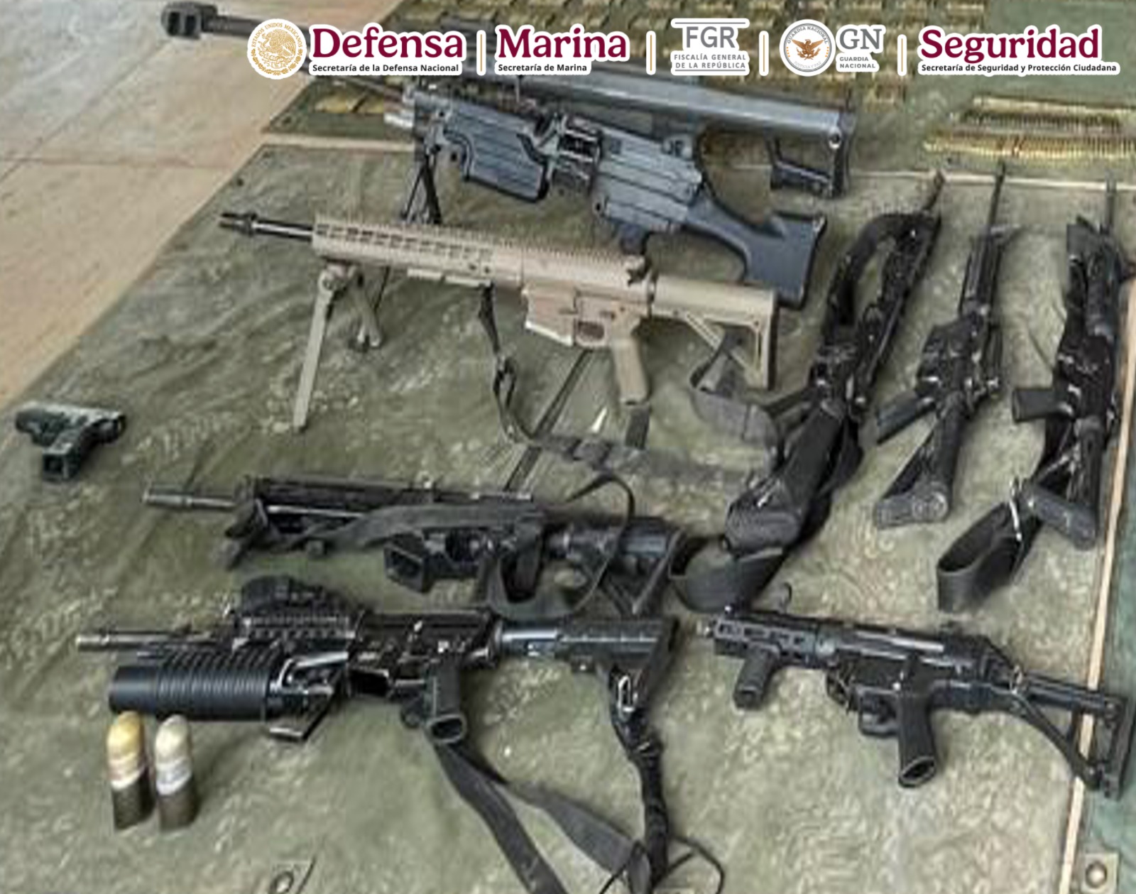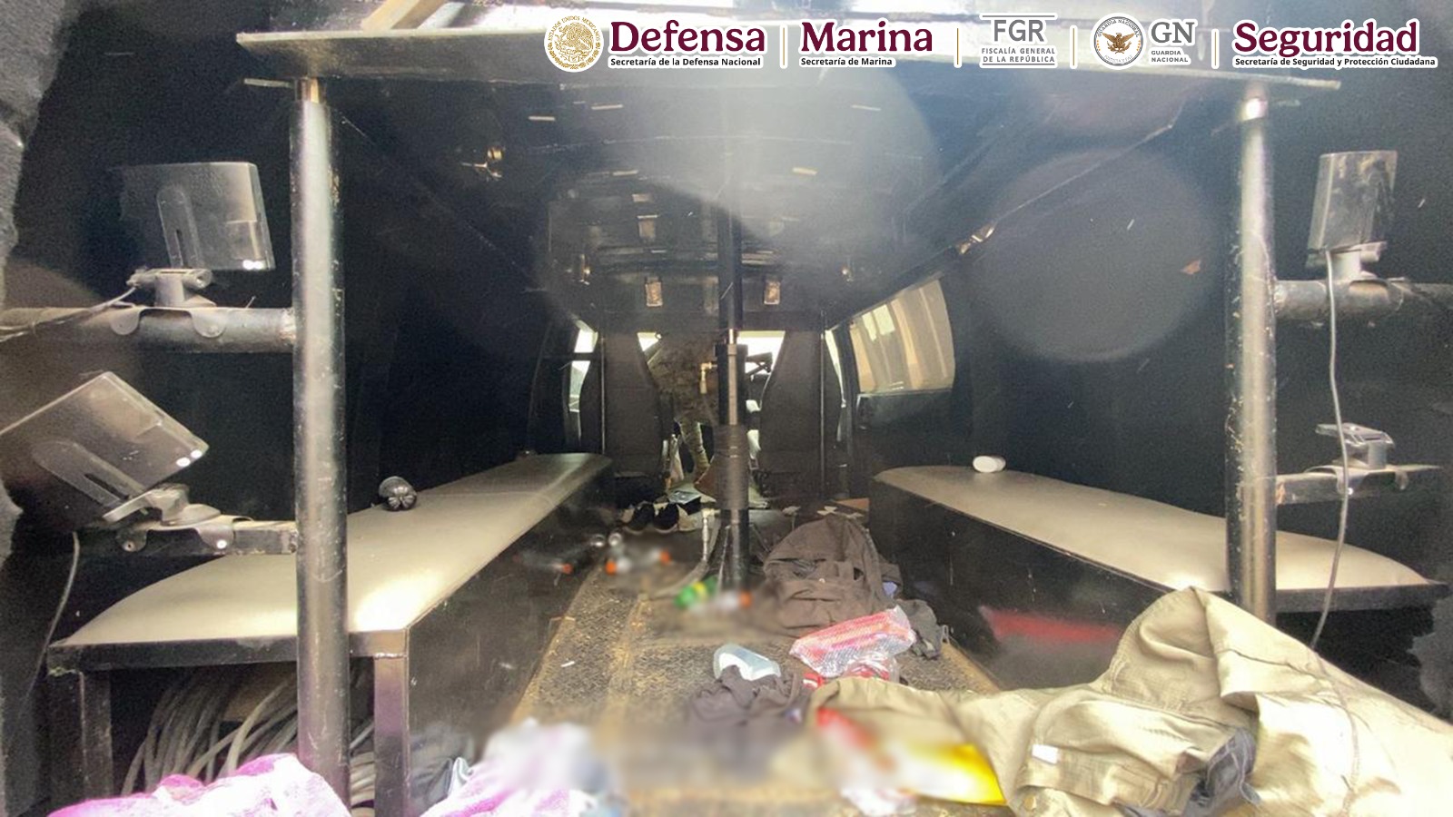 Les aseguraron siete armas largas, un arma corta, cartuchos útiles, 62 cargadores, una bolsa con marihuana, dinero en efectivo, 10 vehículos, equipo táctico, un laboratorio clandestino, 200 litros de acetona, 75 kilos de sosa cáustica, 10 antenas y 47 artefactos explosivos improvisados.