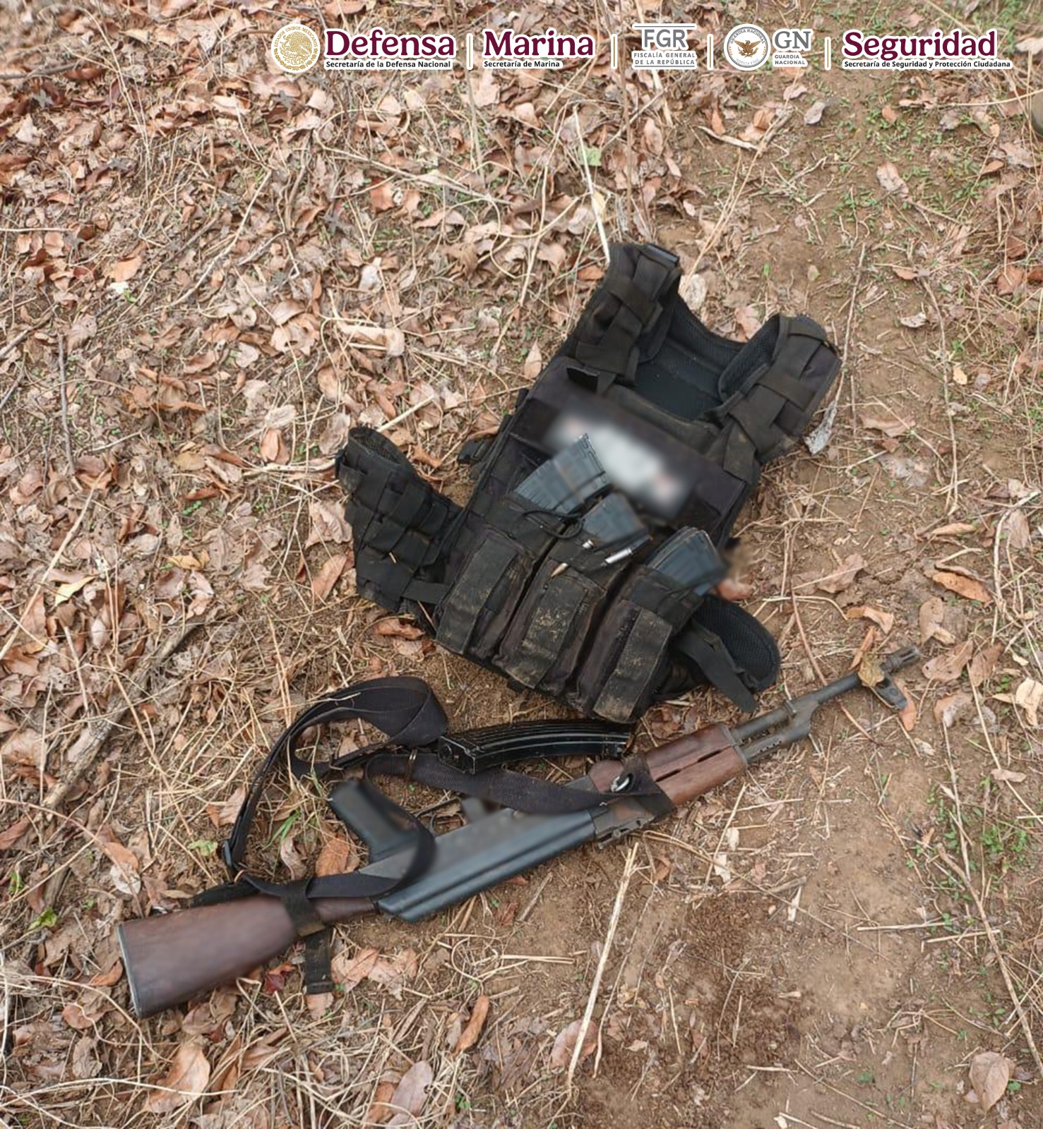 En otra acción, al realizar recorridos terrestres, en el poblado Caminaguato fue detenido un integrante del mismo grupo delictivo, se le aseguraron 10 armas de fuego, entre ellas, un fusil Barret y una ametralladora, además de dos granadas, 12 artefactos explosivos improvisados, 69 cargadores, 2,838 cartuchos útiles, equipo táctico y dos camionetas, una de ellas con blindaje artesanal.
