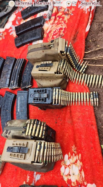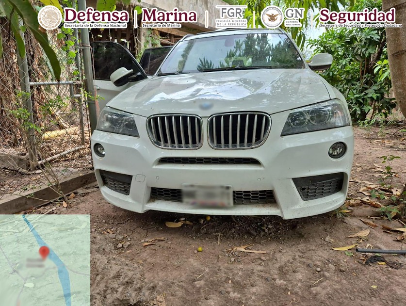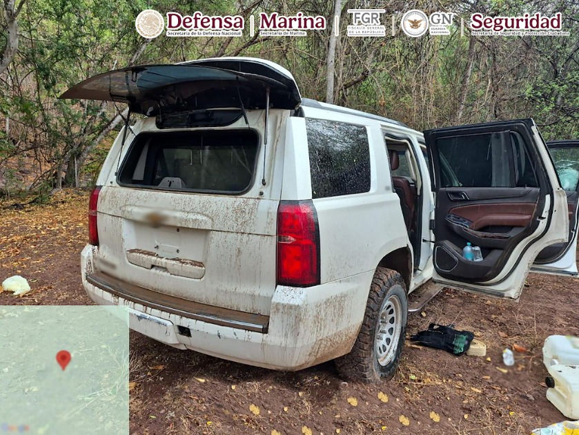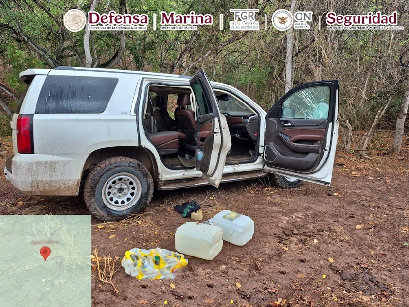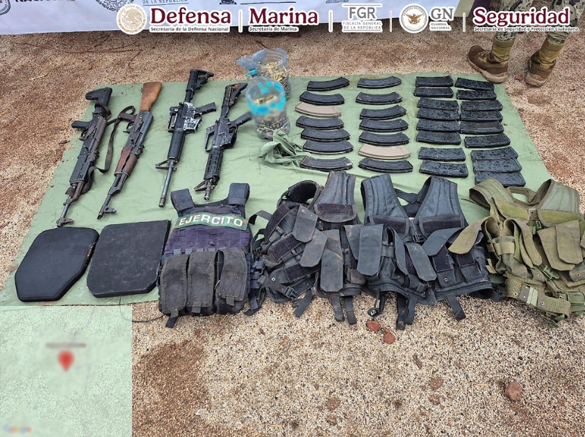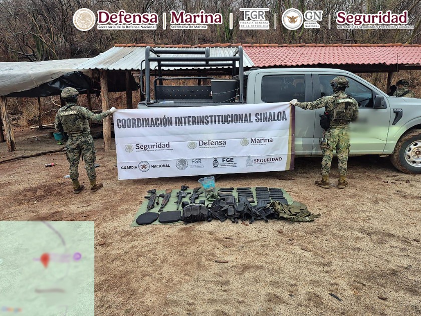 En el poblado de Agua Caliente, del municipio de San Ignacio, al efectuar recorridos de vigilancia aéreos y terrestres, se aseguraron nueve armas largas, entre ellas dos ametralladoras, 63 cargadores y más de 3 mil cartuchos, además de cuatro camionetas, tres de ellas con blindaje.