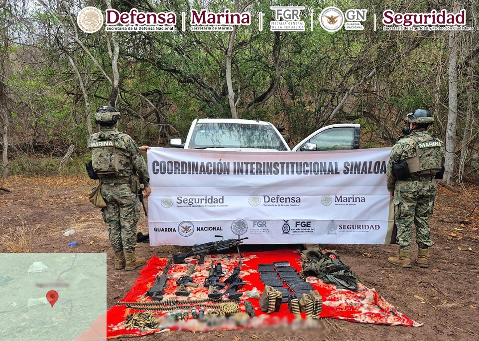 En el poblado de Agua Caliente, del municipio de San Ignacio, al efectuar recorridos de vigilancia aéreos y terrestres, se aseguraron nueve armas largas, entre ellas dos ametralladoras, 63 cargadores y más de 3 mil cartuchos, además de cuatro camionetas, tres de ellas con blindaje.