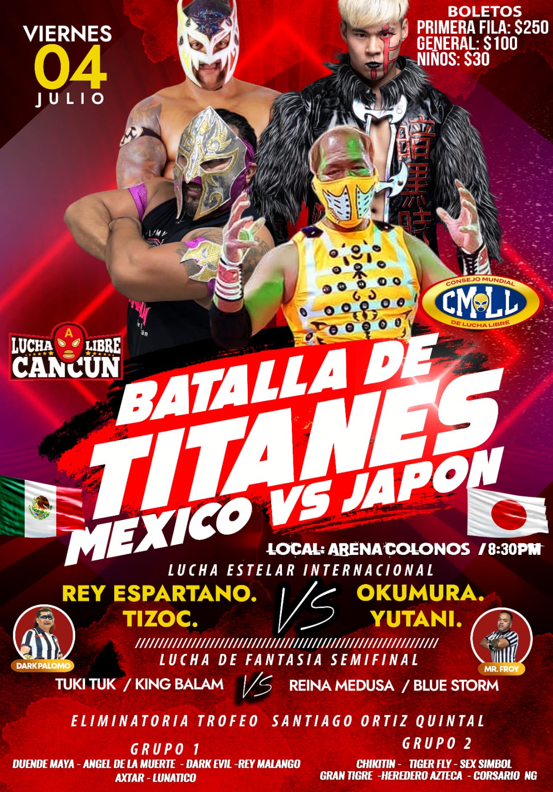 CANCÚN, Q. ROO a 1 de julio.- Con la cercanía del décimo aniversario de la promotora Lucha Libre Cancún (LLC), este próximo viernes 4 de julio en punto de las 20:00 horas en la “Arena Colonos” de la SM 89, se llevará a cabo una función denominada -Batalla de Titanes-, y en la que habrá presencia de luchadores japoneses del Consejo Mundial de Lucha Libre, junto a elementos locales, de los cuales doce de ellos participarán en la primera eliminatoria en pos de la -Primera Copa Santiago Ortiz Quintal- a siete años de su fallecimiento.