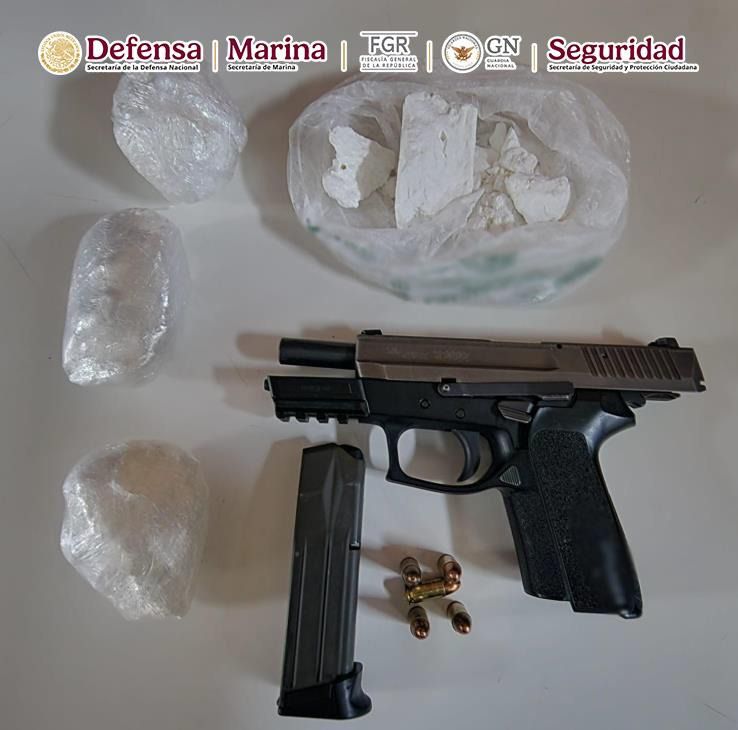 Para descartar alguna conducta ilícita que pusiera en riesgo a la población, los efectivos se le aproximaron y le realizaron una revisión de seguridad, donde le hallaron un arma de fuego corta abastecida con cinco cartuchos, una bolsa con cocaína y tres envoltorios circulares con un material sólido cristalino.