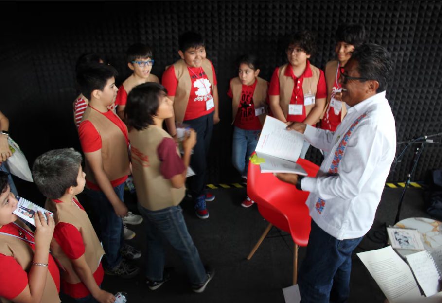 La Fundación Premio Crónica llevó a cabo el segundo taller “Juguemos a ser reporteros”, en el marco de la 36 Feria Internacional del Libro del Museo de Antropología, y en esta ocasión 15 reporteritos entrevistaron al destacado antropólogo Jesús Sánchez y a los autores del libro “Dichos y creencias de los amusgos de Xochistlahuaca, Guerrero”.