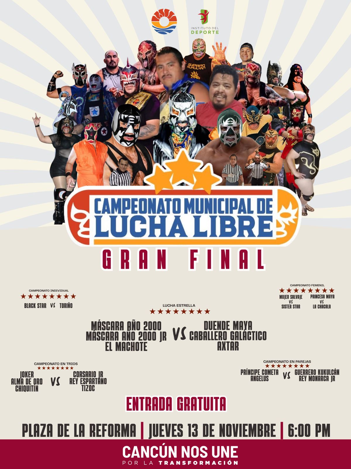 CANCÚN, Q. ROO a 6 de noviembre.- Fue el pasado 22 de marzo cuando se puso en marcha en la Plaza de la Reforma (Palacio Municipal) el primer Campeonato Municipal de Lucha Libre, y exactamente 237 días después, ese sitio emblemático de Cancún volverá a convertirse por unas horas en una Arena luchística, ya que el próximo jueves 13 de noviembre a partir de las 18:00 horas, se llevarán a cabo las Finales de cada una de las categorías en competencia para conocer a los campeones.