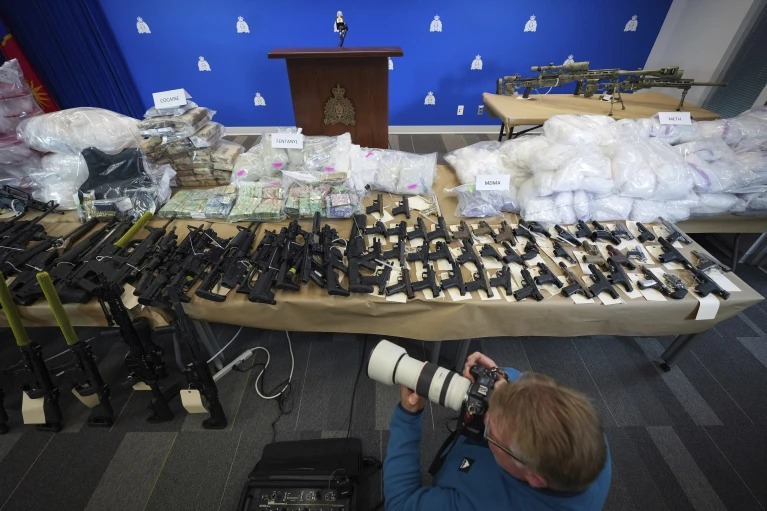 También encontraron un total de 89 armas de fuego, entre pistolas, rifles tipo AR-15 y metralletas, así como pequeños dispositivos explosivos, municiones, silenciadores, cargadores de alta capacidad, chalecos antibalas y 500 mil dólares canadienses (359 mil dólares estadounidenses) en efectivo.