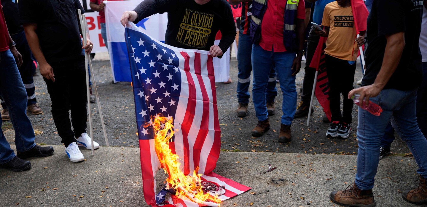 Un centenar de personas se manifestaron este lunes en Panamá frente a la residencia del embajador de Estados Unidos, donde quemaron banderas de ese país en protesta por la promesa del presidente Donald Trump de retomar el control del canal interoceánico.