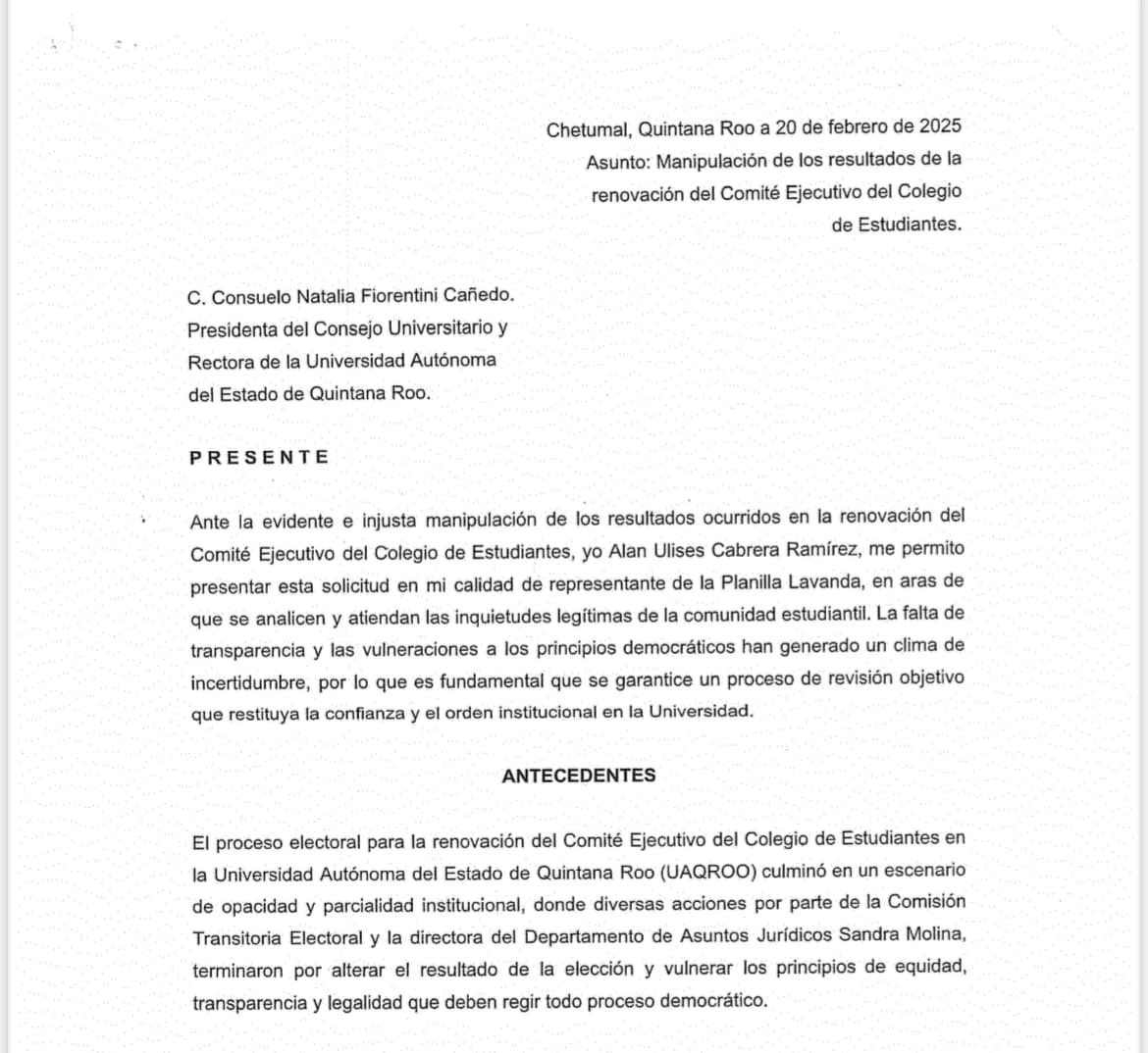 En Pie de Lucha por Descarado Fraude Electoral, Estudiantes de la Universidad de Quintana Roo Envían Carta a su Rectora Natalia Fiorentini