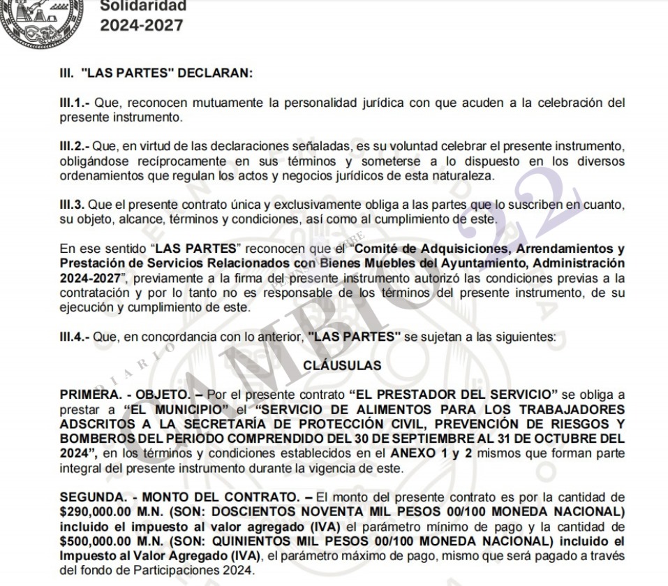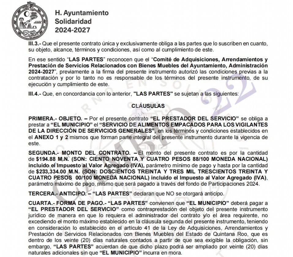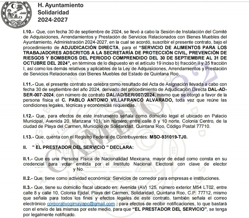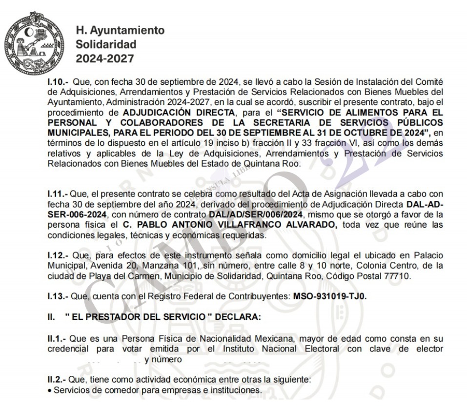 El Ayuntamiento de Solidaridad, Quintana Roo, encabezado por la presidenta municipal Angy Estefanía Mercado Asencio, enfrenta cuestionamientos sobre la contratación directa de servicios alimenticios destinados a diversas áreas municipales, en total, son cuatro contratos que suman más de 3 millones de pesos presuntamente vinculados a el cuarto regidor de la actual administración municipal en Playa del Carmen y que fueron otorgados a un solo proveedor, Pablo Antonio Villafranco Alvarado.