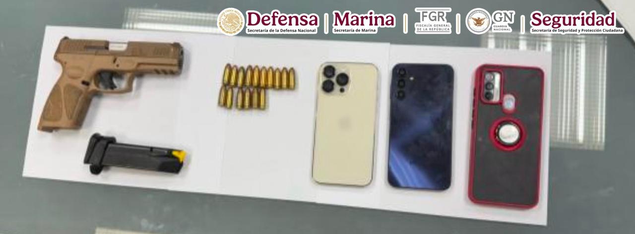 Resultado del reforzamiento de seguridad en el estado de Tabasco, elementos de la Secretaría de la Defensa Nacional (Defensa), Secretaría de Marina (Semar), Fiscalía General de la República (FGR), Guardia Nacional (GN), Secretaría de Seguridad y Protección Ciudadana (SSPC), junto con la Secretaría de Seguridad y Protección Ciudadana y Fiscalía General del Estado, ambas de Tabasco, detuvieron a dos hombres, entre ellos Adrián “N”, vinculado a una célula delictiva y generador de violencia en la entidad, se aseguró un arma de fuego y equipos telefónicos.