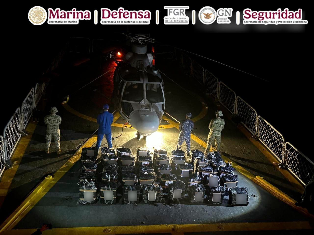 Esta acción se llevó a cabo durante recorridos de patrullaje de vigilancia marítima y aérea para el mantenimiento del Estado de derecho en la mar, en la que participaron embarcaciones y unidades aéreas de la Armada de México, con lo que se avistó una carga y se aseguraron 47 bultos con un peso de 1,354 kilogramos de presunta cocaína; en seguimiento a esta operación, se localizó una carga adicional de 40 bultos con un peso de 1,196 kilogramos de cocaína.