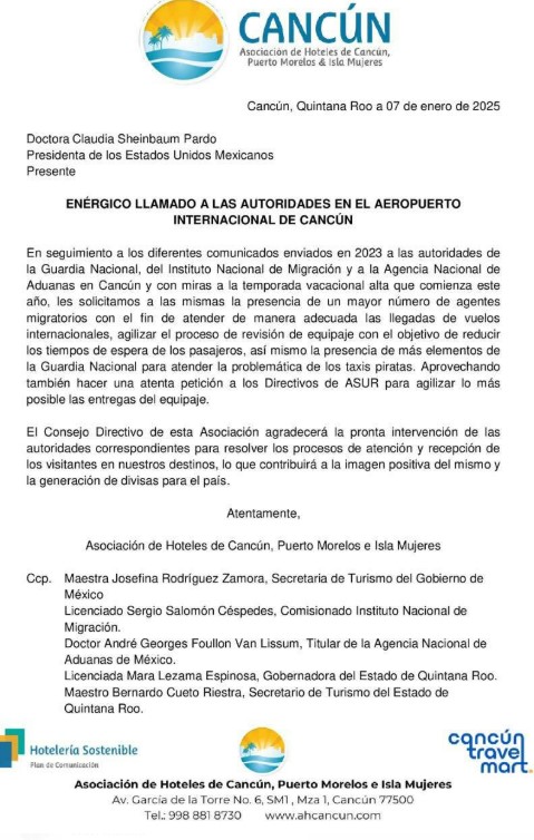 En la carta también hace una petición a ASUR para agilizar la entrega del equipaje. El consejo directivo de la asociación, agradece la intervención de las autoridades y que se pueda resolver la atención y recepción de los visitantes en los destinos de Quintana Roo. La carta va dirigida también a la Secretaria de Turismo, al Comisionado del INM, Aduanas y al Secretario de Turismo del estado, así como a la mandataria estatal.