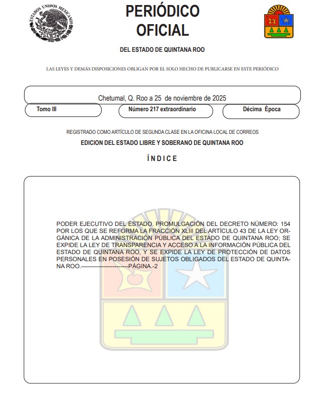 CHETUMAL, 26 de noviembre.- Este miércoles entró en vigor la nueva Ley de Transparencia y Acceso a la Información Pública del Estado, con lo que se extingue del órgano público autónomo Instituto de Acceso a la Información y Protección de Datos Personales de Quintana Roo (Idaipqroo), luego de que el martes 25 de noviembre fue publicado en el Periódico Oficial del Estado el decreto que la emite junto con la Ley de Protección de Datos Personales en Posesión de Sujetos Obligados del Estado.
