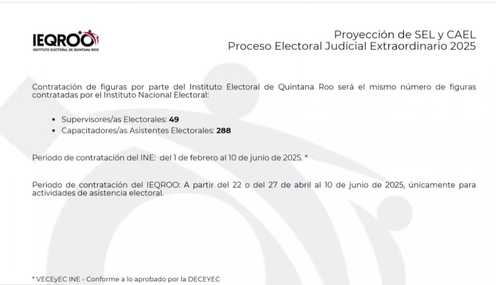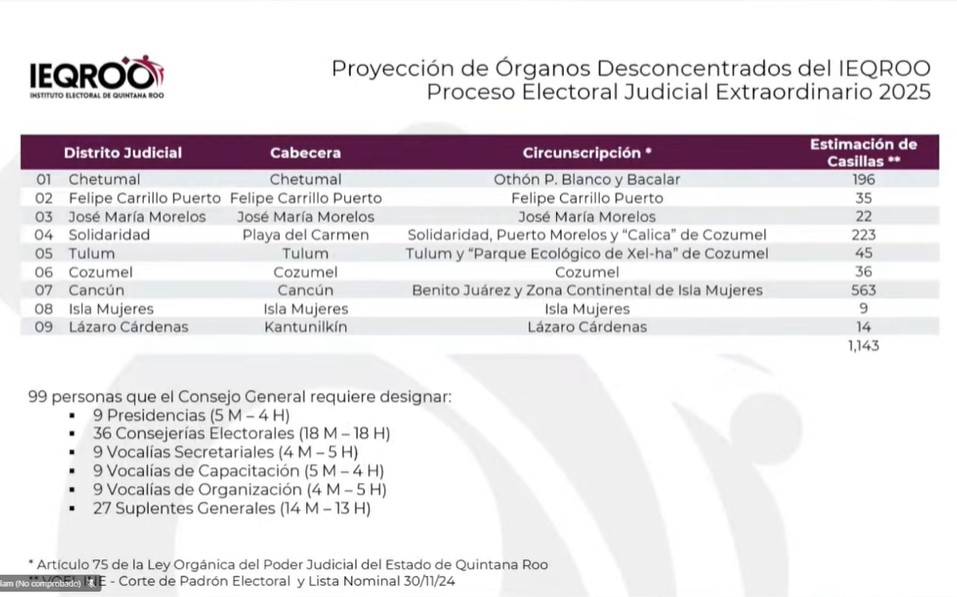 En tanto, indicó que el INE, que organiza la elección judicial federal con la que será concurrente la local, ya definió que en Quintana Roo habrá mil 143 casillas seccionales, con al menos una casilla en las secciones con más de 100 habitantes y con casillas básicas y hasta 3 contiguas en las secciones con más de 4 mil electores.