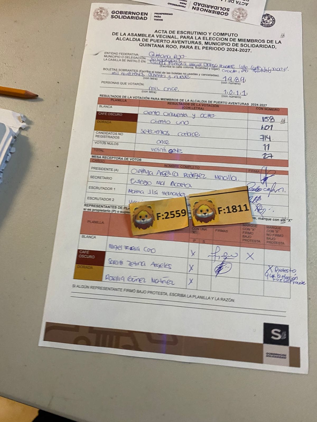 De acuerdo con los votos, en la casilla ubicada en la escuela secundaria, “José Antonio Tzuc Esparza”, la planilla Dorada encabezada por Gilberto Gómez obtuvo 951 votos; la planilla Blanca representada por Graciela Moreno Guzmán recibió 69 sufragios y Damaris Ortega de la planilla Café Oscuro recibió 80; además de 28 votos nulos, cuatro a candidatura no registrada, para un total de mil 104 válidos de las 3 mil boletas disponibles.