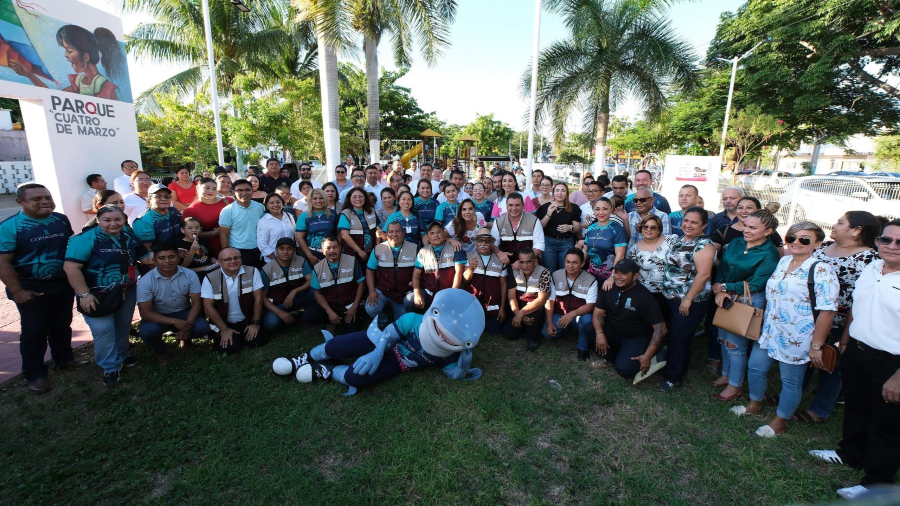 Chetumal.- Para el bienestar de casi 2 mil familias de la colonia 8 de Octubre, la gobernadora Mara Lezama Espinosa les entregó el rescatado y remodelado parque 4 de Marzo a través del programa “Que Brille Chetumal”, al que se sumaron jóvenes del Colegio de Bachilleres.