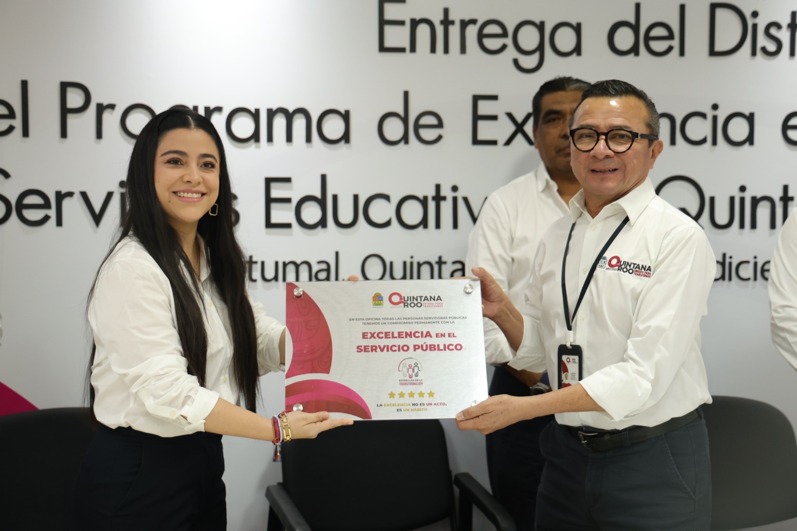 Chetumal.- Con el objetivo de reconocer el compromiso institucional con la transparencia, la mejora continua y una atención digna y de calidad a la ciudadanía, la Secretaría Anticorrupción y Buen Gobierno del Estado de Quintana Roo (SABGOB) otorgó a los Servicios Educativos de Quintana Roo (SEQ) el Distintivo de Excelencia en el Servicio Público.