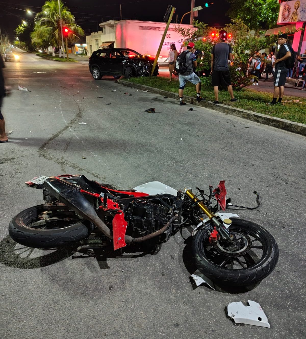 El impacto provocó que la motocicleta avanzara sin control, golpeara un semáforo del camellón central y finalmente terminara sobre el pavimento, mientras el cuerpo del conductor quedó tendido en el carril derecho de la avenida Chetumal.