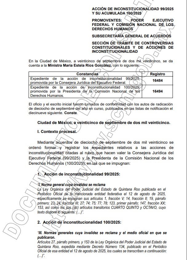 Las dos acciones de inconstitucionalidad ante la Suprema Corte de Justicia de la Nación (SCJN) fueron radicadas el 18 de septiembre y marcadas con los números de expediente 99 y 100/2025, después de lo cual fueron acumuladas para ser resueltas al mismo tiempo.
