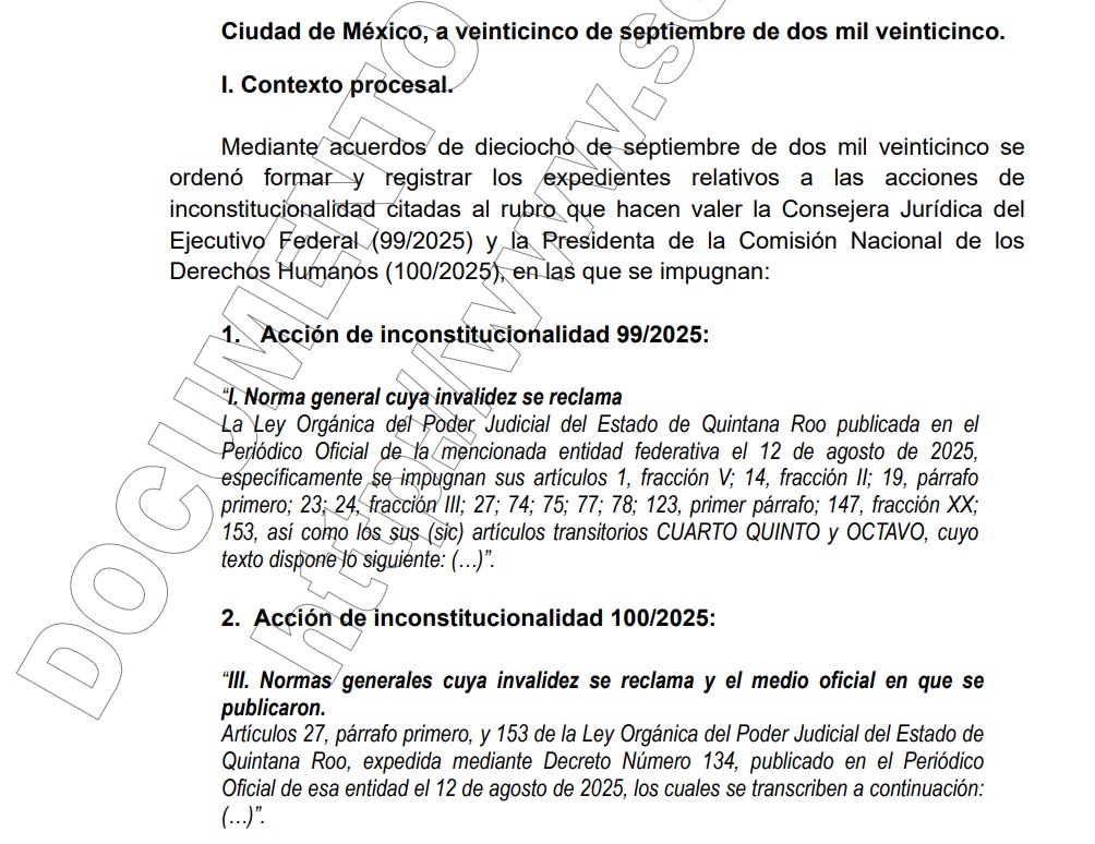 CHETUMAL, 9 de septiembre.- La presidenta de la República, Claudia Sheinbaum Pardo, a través de su Consejera Jurídica, Ernestina Godoy, y la Comisión Nacional de Derechos Humanos (CNDH), presidida por Rosario Piedra Ibarra, impugnaron con acciones de inconstitucionalidad artículos de la Ley Orgánica del Poder Judicial del Estado de Quintana Roo, especialmente el que permitió a Heyden Cebada Rivas ser reelecto en la presidencia del Tribunal Superior de Justicia del Estado (TSJE), debido a que viola la regla constitucional federal de que el cargo debe ser rotativo entre magistrados y magistradas que fueron electos.