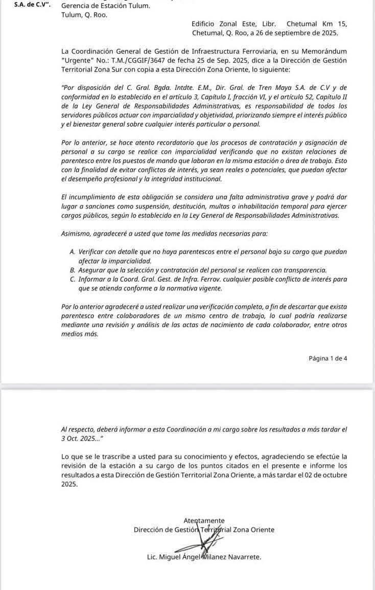 Estas acciones contravienen un memorándum interno de la Dirección de Gestión Territorial del Tren Maya, con fecha del 26 de septiembre, que recuerda la necesidad de realizar los procesos de contratación con imparcialidad y de “verificar que no existan relaciones de parentesco”, entre los puestos de mando que laboran en la misma estación.