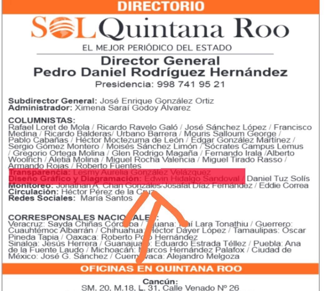 La alcaldesa de Benito Juárez Ana Patricia Peralta de la Peña, el alcalde de Bacalar José Chepe Contreras y la ex directora de obras públicas del estado de Quintana Roo Irazu Sarabia May le dieron contratos millonarios que suman un total de $12 millones 837 mil 857.60 pesos al diseñador gráfico del periódico Sol Quintana Roo Edwin Hidalgo Sandoval a pesar de no tener la experiencia necesaria ni la solvencia económica real para llevar dichas obras, más bien pareció un ¡pago de favores! pero con los impuestos de todos los Quintanarroenses.