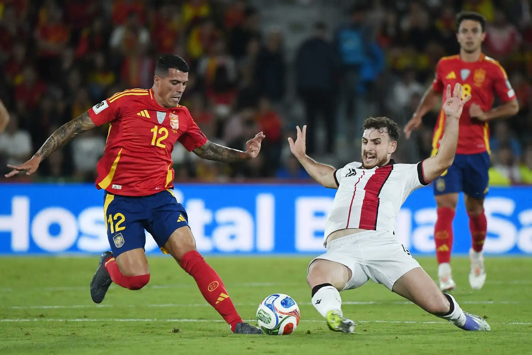 España se adueñó del balón y lo intentó por varios medios, mientras Georgia cerró los espacios. Mikel Oyarzabal remató de cabeza y el balón rozó el travesaño tras un tiro de esquina al 18’.