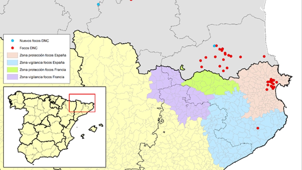 Desde los 17 brotes reportados en el mes de octubre, España no ha detectado focos nuevos y acumula una racha de más de dos meses sin positivos entre el ganado. Sin embargo, se mantienen las restricciones implementadas a principios del otoño, con zonas de restricción (20 kilómetros) y de vigilancia (50 kilómetros), límites para el movimiento de animales y mayor cuidado con las medidas de bioseguridad en las explotaciones de ganado vacuno. Mientras, se mantiene el ojo puesto en Francia: Agricultura investiga los movimientos realizados desde los Departamentos de Ariège, Altos Pirineos, Aude y Alta-Garona a España en las últimas semanas, para prevenir futuros posibles focos de la enfermedad, mientras que los Servicios Veterinarios Oficiales (SVO) de Cataluña y Aragón estudian los establecimientos de destino de dichas importaciones, para descartar la presencia de síntomas o lesiones compatibles con la DNC, y para la inmovilización y toma de muestras oficiales en caso de haber cualquier sospecha durante las visitas.