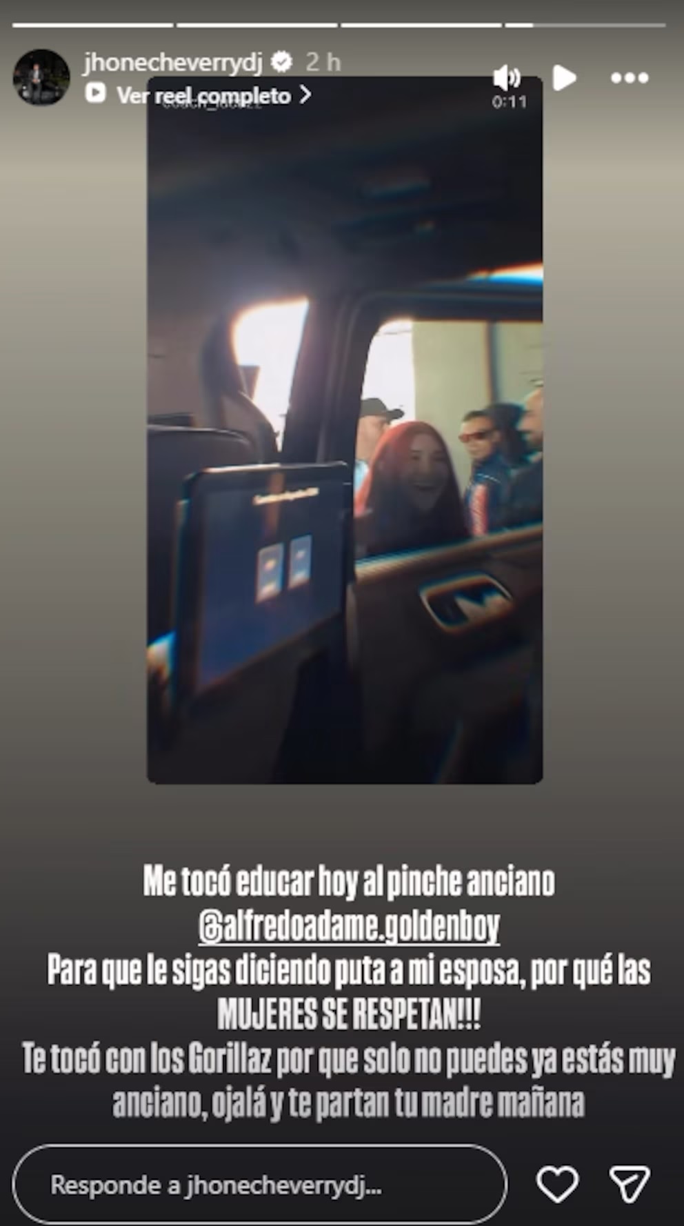“Me tocó educar al anciano de Alfredo Adame, para que no le siga diciendo p*ta a mi esposa, porque a las mujeres se les respeta”, publicó; y añadió: “Te tocó defenderte con tus gorilas porque solo no puedes porque estás muy anciano; ojalá te partan tu maíz mañana en la pelea”.