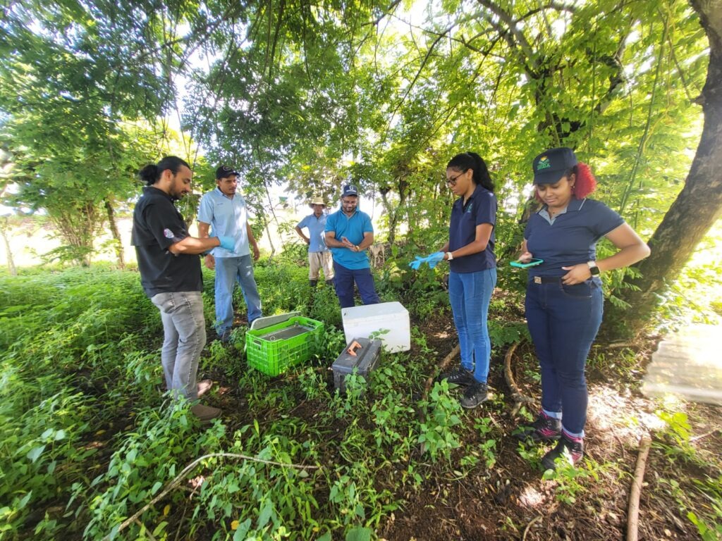 A unos kilómetros de distancia del punto de verificación de Capira, una veintena de productores, propietarios de fincas en las zonas vecinas, se reúnen con médicos y técnicos de la COPEG. Frente a ellos, se despliega una presentación con información sobre cómo hacer curaciones en heridas de los ombligos de bovinos —una de las principales causas de incidencia de la enfermedad de miasis— y de buenas prácticas para proteger al ganado de la amenaza del GBG.