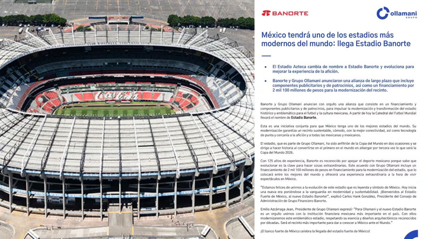 “A partir de hoy la Catedral del Futbol Mundial llevará el nombre de Estadio Banorte”, indica el comunicado en el que se explica que Banorte y Ollamani financiarán el cambio del Azteca con más de 2 mil 100 millones de pesos.