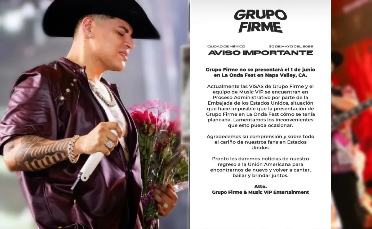 Con un comunicado publicado en sus redes sociales, la agrupación explicó: “Actualmente las visas de Grupo Firme y el equipo de Music VIP se encuentran en Proceso Administrativo por parte de la Embajada de Estados Unidos, situación que hace imposible que la presentación de Grupo Firme en La Onda Fest como se tenía planeada”.