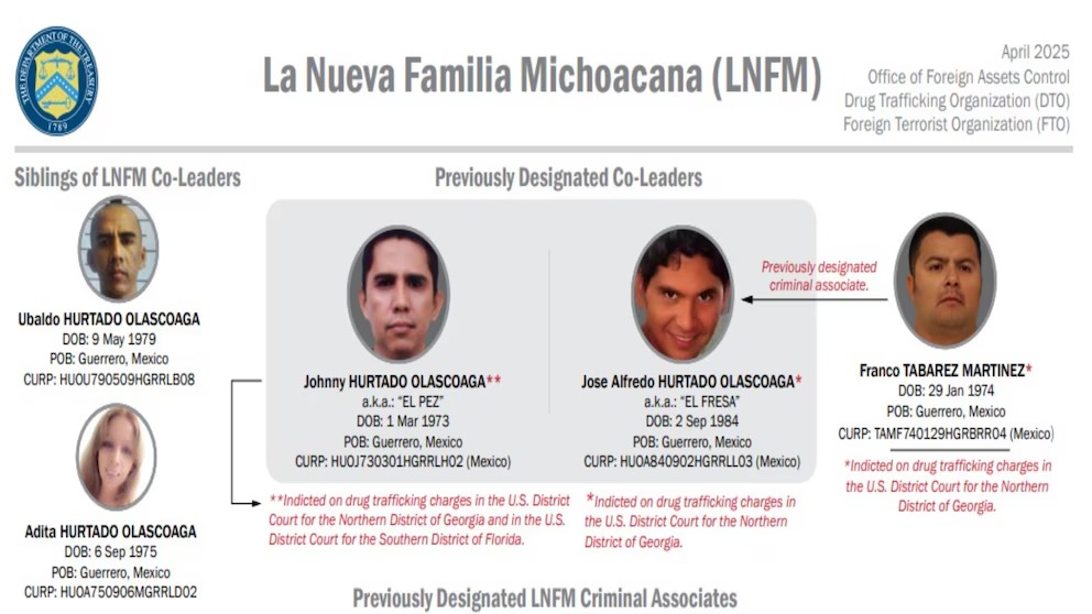 A través de la Oficina de Control de Activos Extranjeros (OFAC, por sus siglas en inglés), el Gobierno de Estados Unidos anunció una nueva serie de sanciones en contra de cuatro personas identificadas como parte del cártel de La Nueva Familia Michoacana (LNFM), entre los que destacan los hermanos Johnny y José Alfredo Hurtado Olascoaga, presuntos líderes de la “Organización Terrorista Extranjera y Terrorista Global”.