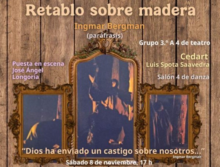 Basada en textos del dramaturgo y cineasta sueco Ingmar Bergman, Retablo sobre madera es una paráfrasis escénica que retoma cuatro monólogos originalmente escritos como ejercicios teatrales y que posteriormente inspiraron la película El séptimo sello. La obra explora temas como la existencia de Dios, la religiosidad, la muerte, la peste y el apocalipsis, a través de cinco personajes: la joven, el caballero, la muerte, la bruja y la mensajera.