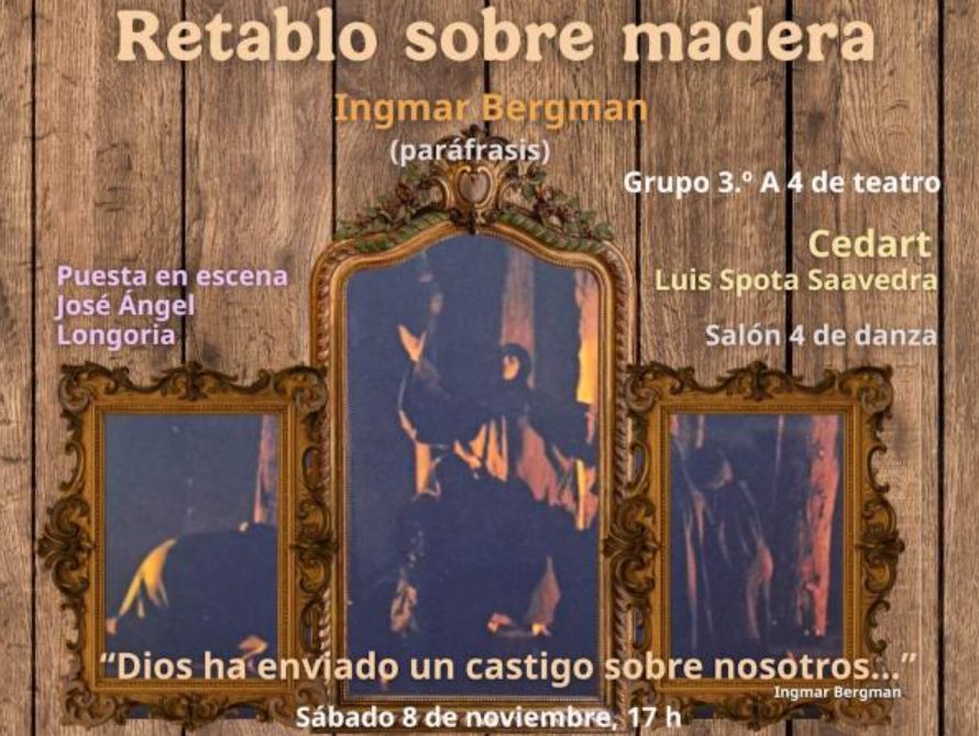 El Centro de Educación Artística (CEDART) Luis Spota Saavedra, adscrito a la Subdirección General de Educación e Investigación Artísticas (SGEIA) del Instituto Nacional de Bellas Artes y Literatura (INBAL), presentará la puesta en escena Retablo sobre madera el 8 de noviembre, a las 17 horas, en el Salón 4 de la escuela. La obra, dirigida por el maestro José Ángel Longoria, cuenta con la participación de estudiantes de tercer grado en la asignatura de Teatro.