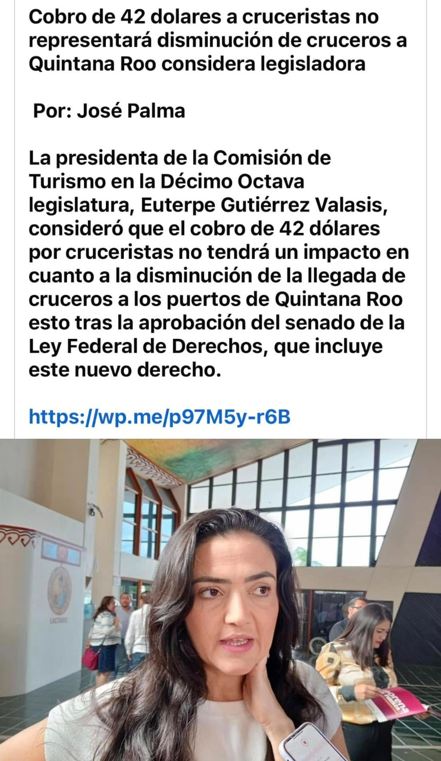 04 de diciembre-. Mientras la gobernadora de Quintana Roo, Mara Lezama Espinosa, declaró hoy sobre los esfuerzos de su administración para sensibilizar al gobierno federal y lograr con ello que el Derecho de No Residente no se cobre (o se cobre gradualmente… o que haya una prórroga para que o cobro del mismo…. ¡O que se destine parte del cobro para mejora y construcción de infraestructura…ALGO!) a partir de 2025; la presidenta de la Comisión de Turismo en el congreso quintanarroense, Euterpe Gutiérrez Valasis, declaró este miércoles que, dicho gravamen, pues no afectará la actividad turística de cruceros…