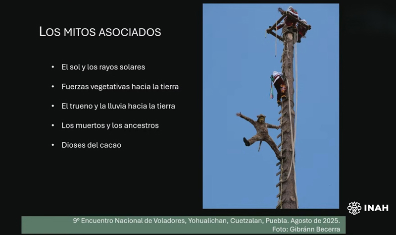 El mito, contenido en el relato del Popol Vuh, el libro sagrado de los mayas, establece que el juego de pelota es la llave para entrar al inframundo, mientras que en el caso de los voladores no hay nada escrito, es parte de la sabiduría oral y se trata de un ciclo de renovación que simboliza el ascenso al supramundo, anotó.