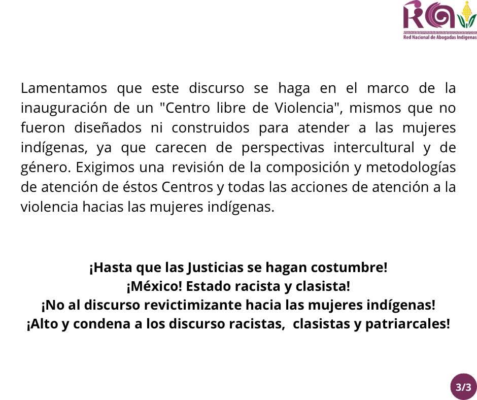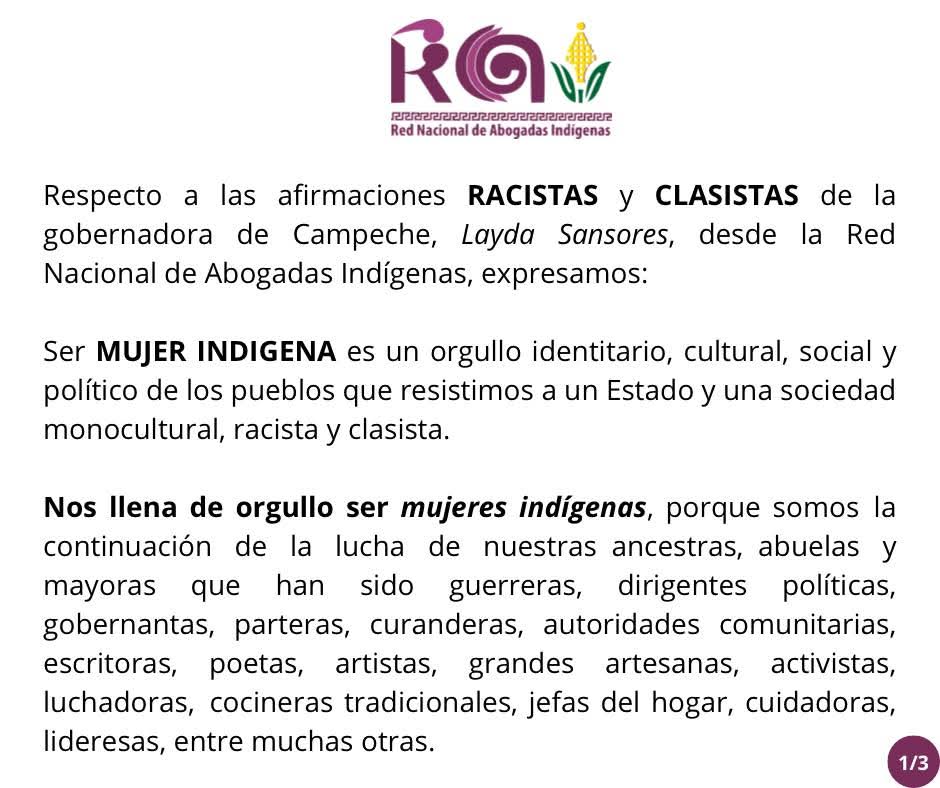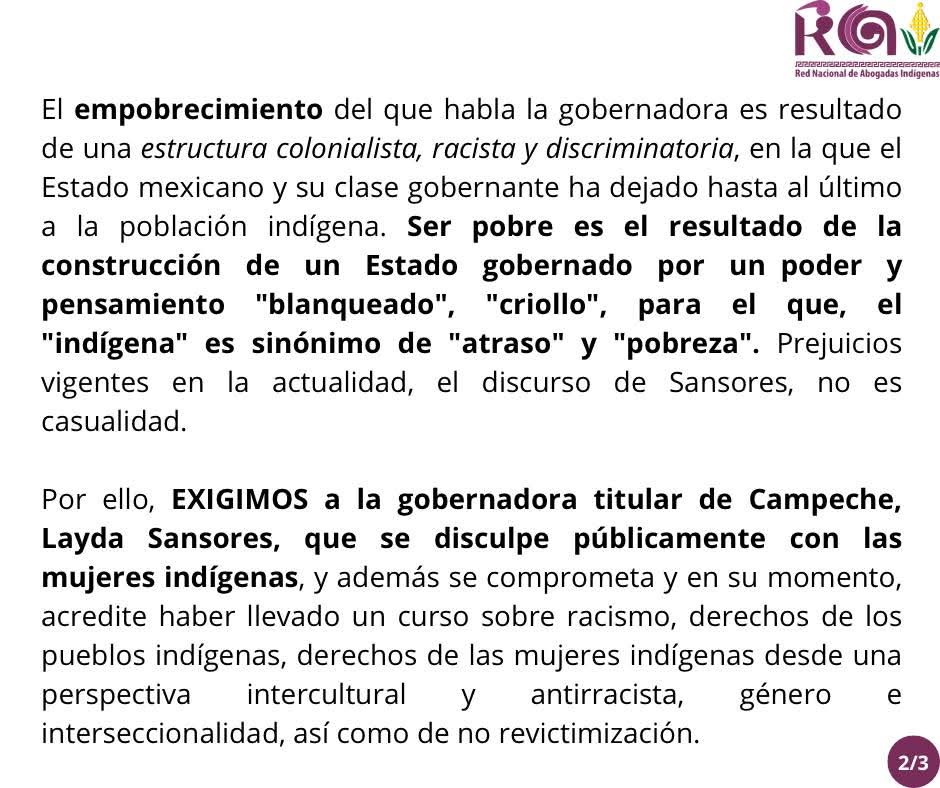 Tras el dialate de la Gobernadora la Red Nacional de Abogadas Indígenas (RAI-MX) reaccionó de inmediato, calificando las palabras como racistas y clasistas, al señalar que reducen a una condición negativa la identidad de los pueblos originarios. El colectivo exigió una disculpa pública y que la gobernadora participe en un curso sobre racismo, derechos humanos y perspectiva de género.