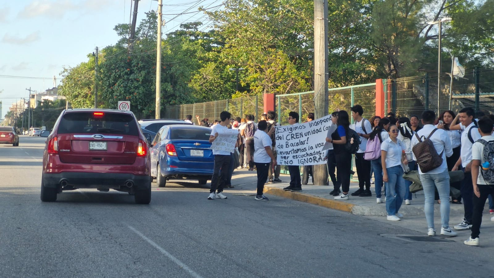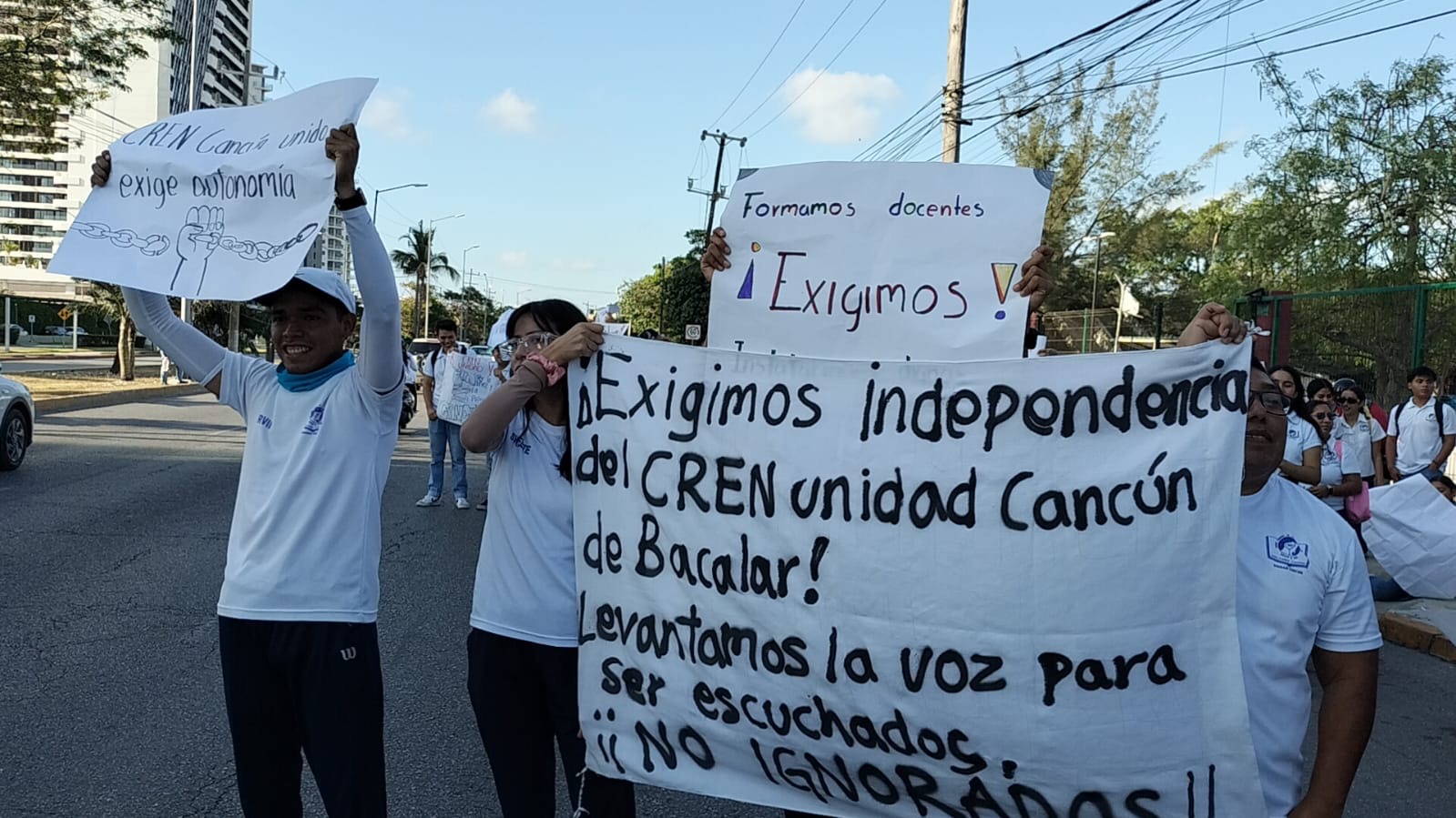 Cancún, Quintana Roo, 02 de Mayo del 2025.- Estudiantes de la Escuela Normal Superior, Unidad Cancún, realizaron una manifestación pacífica frente a las instalaciones de la Secretaría de Educación en el municipio de Benito Juárez.