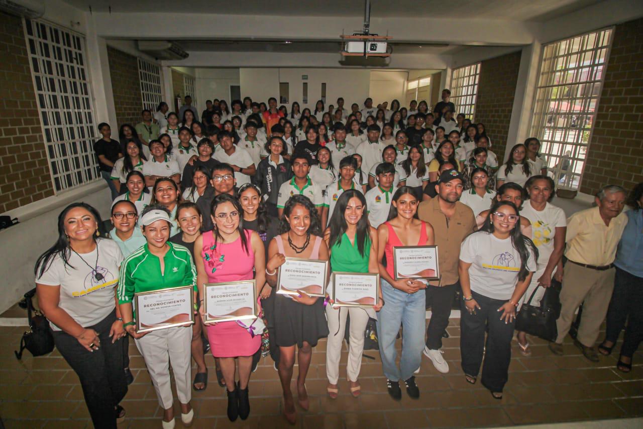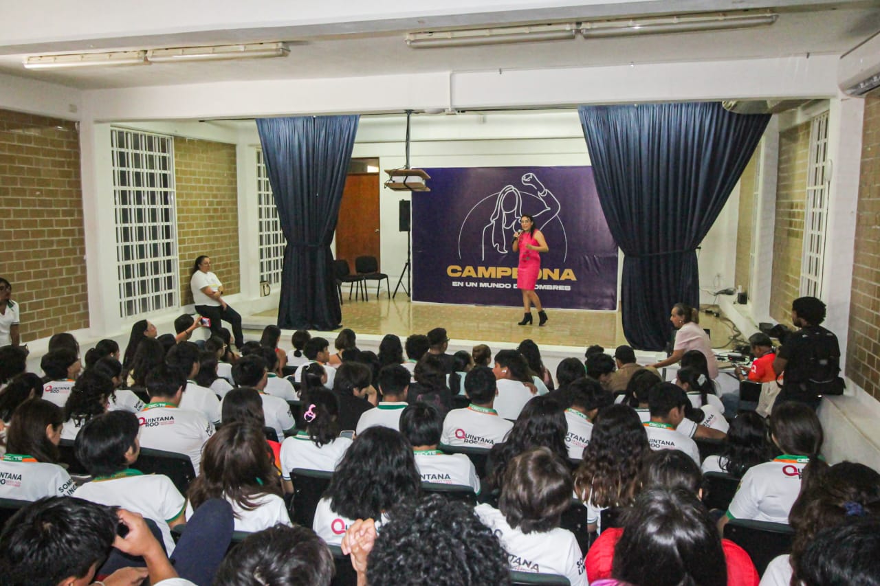 Playa del Carmen, 14 de mayo del 2025.- Con el objetivo de difundir que todo esfuerzo tiene su recompensa y que nada es imposible, si te lo propones, la sexta edición del programa “Campeona en un mundo de hombres”, atletas playenses de alto rendimiento compartieron sus sueños, experiencias, retos y dificultades superadas para conseguir resultados favorables a estudiantes del Cecyte, Plantel I de Playa del Carmen.