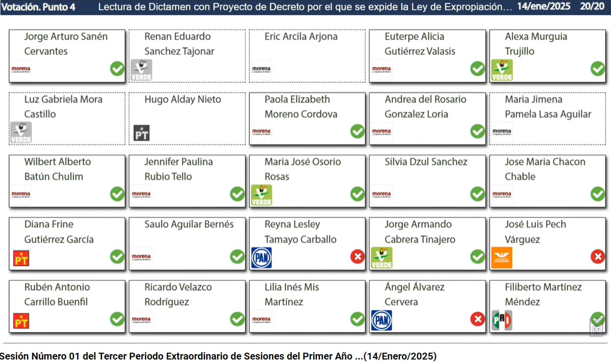 CHETUMAL, 14 de enero.- En sesión extraordinaria realizada este martes, la XVIII Legislatura del Estado aprobó por mayoría la nueva Ley de Expropiación, Ocupación Temporal y Limitación de Dominio, con 17 votos a favor de Morena, PVEM, PT y PRI, y 3 votos en contra de PAN y MC.