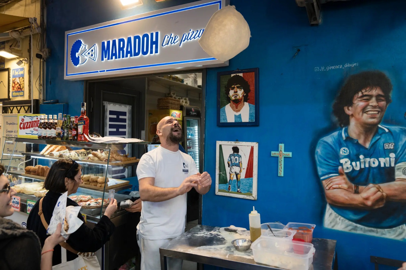 Junto a la estación de tren de Nápoles hay un enorme mural de Maradona, la leyenda argentina del fútbol que llevó al Nápoles a ganar campeonatos y que se ha convertido en uno de los mayores héroes populares de la ciudad, y en un símbolo de esperanza y orgullo napolitano. Pequeño, dentro del iris de Maradona, un artista pintó un retrato de Francesco Pio.