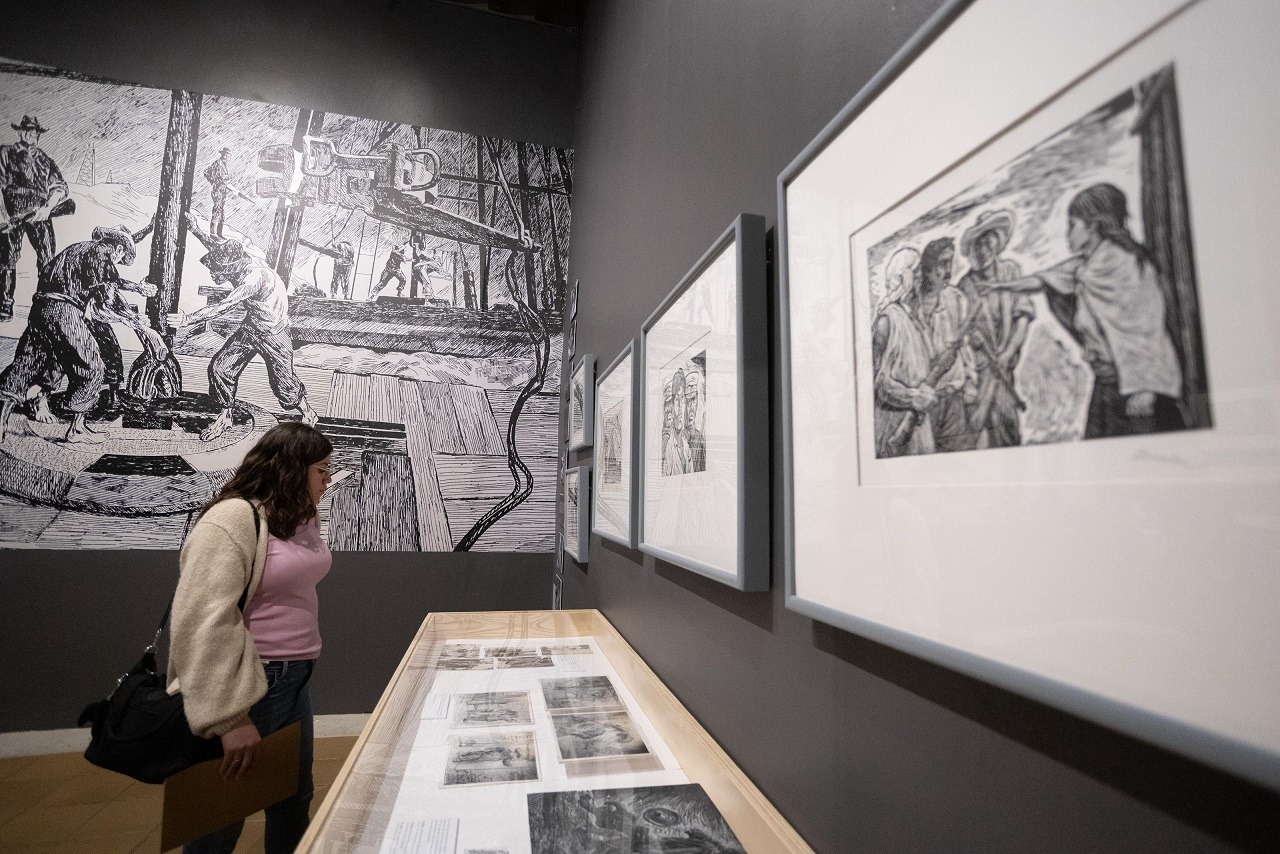 La muestra reúne 48 grabados originales, entre linografía, xilografía, litografía y la poco frecuente técnica del cliché-verre, acompañados de 49 fotogramas, siete carteles y documentos personales. Esta selección permite apreciar la diversidad de su trabajo y la relación con el cine nacional de la época.