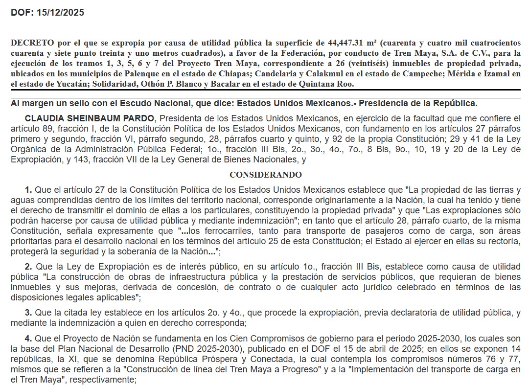 CHETUMAL, 15 de diciembre.- La presidenta de México, Claudia Sheinbaum, expidió un decreto por el que se expropian 44 mil 447.31 metros cuadrados de 26 predios privados en los municipios de Palenque, Chiapas; Candelaria y Calakmul Campeche; Mérida e Izamal, Yucatán; Solidaridad (Playa del Carmen), Bacalar y Othón P. Blanco, Quintana Roo, para obras del proyecto de carga del Tren Maya.