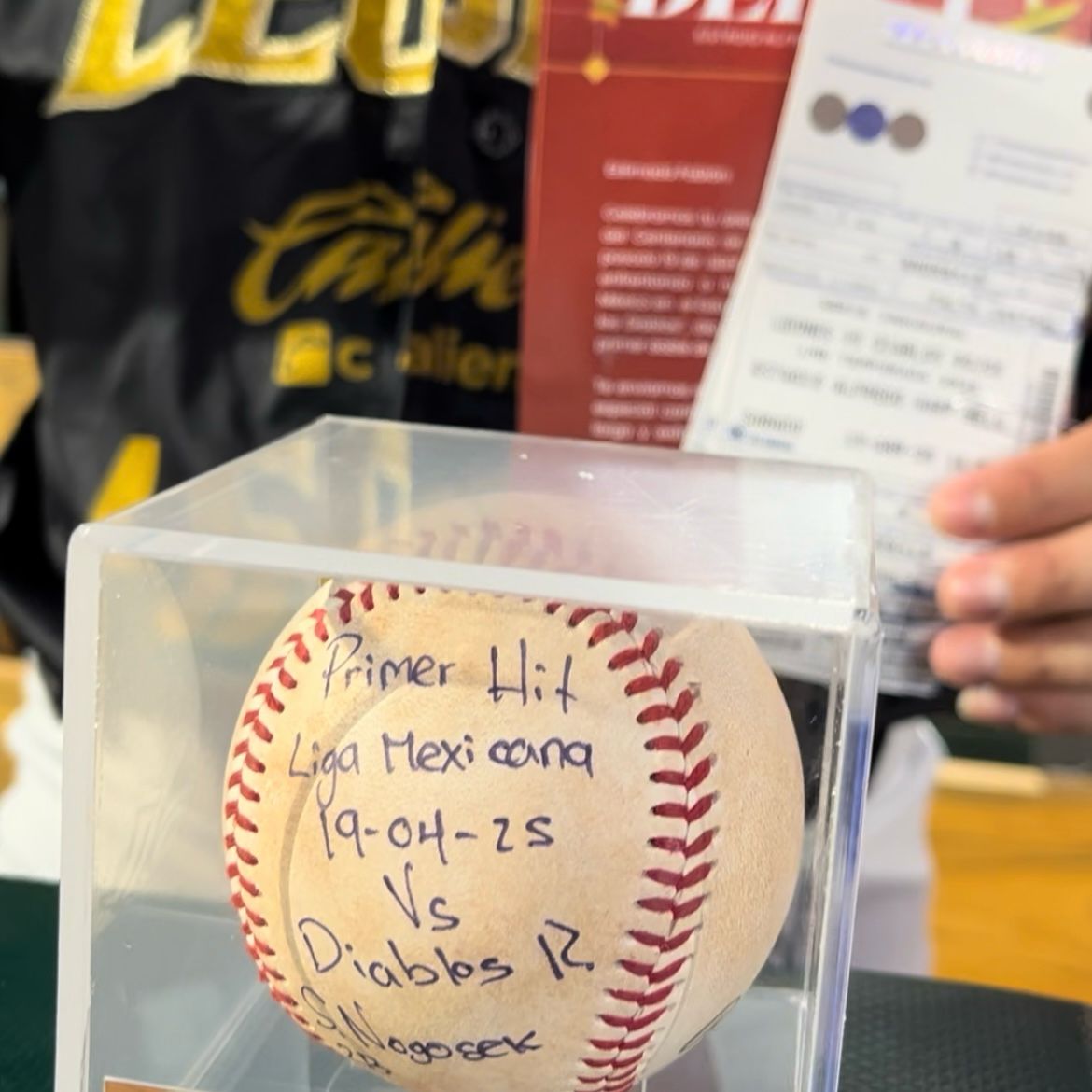 El pelotero bonfileño, quien debutó este año en la LMB con los Leones de Yucatán, se hizo acreedor a la pelota con la que conectó su primer imparable, mismo que fue un doblete ante los Diablos Rojos del México el pasado 19 de abril en el estadio “Alfredo Harp Helú” de la Ciudad México.