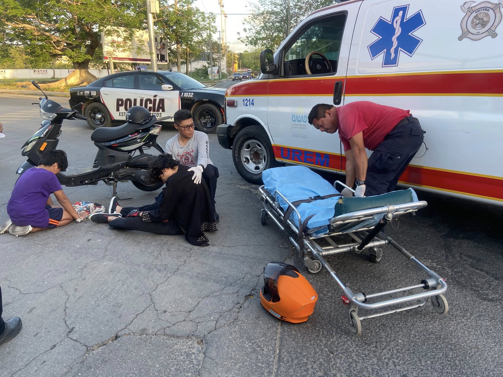 Chetumal, 9 de junio.- Un percance vial se registró la tarde de este domingo en el cruce de las calles Antonio Plaza y Juan de Dios Peza, donde dos menores de edad que viajaban en una motocicleta resultaron lesionados tras impactarse contra un vehículo compacto.